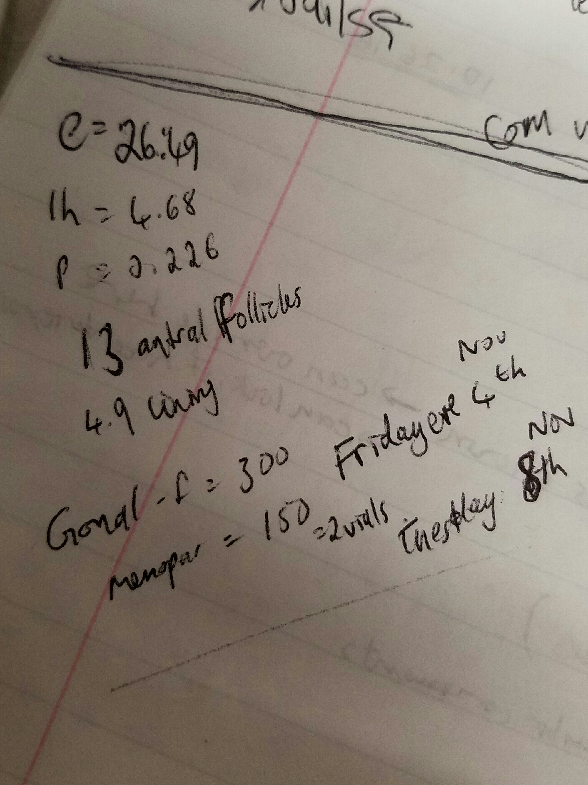 Notes: estrogen=26.49; LH=4. 68; progesterone=0.226; lining=4.9mm; antral follicles=13 (it was on the voice mail lol)